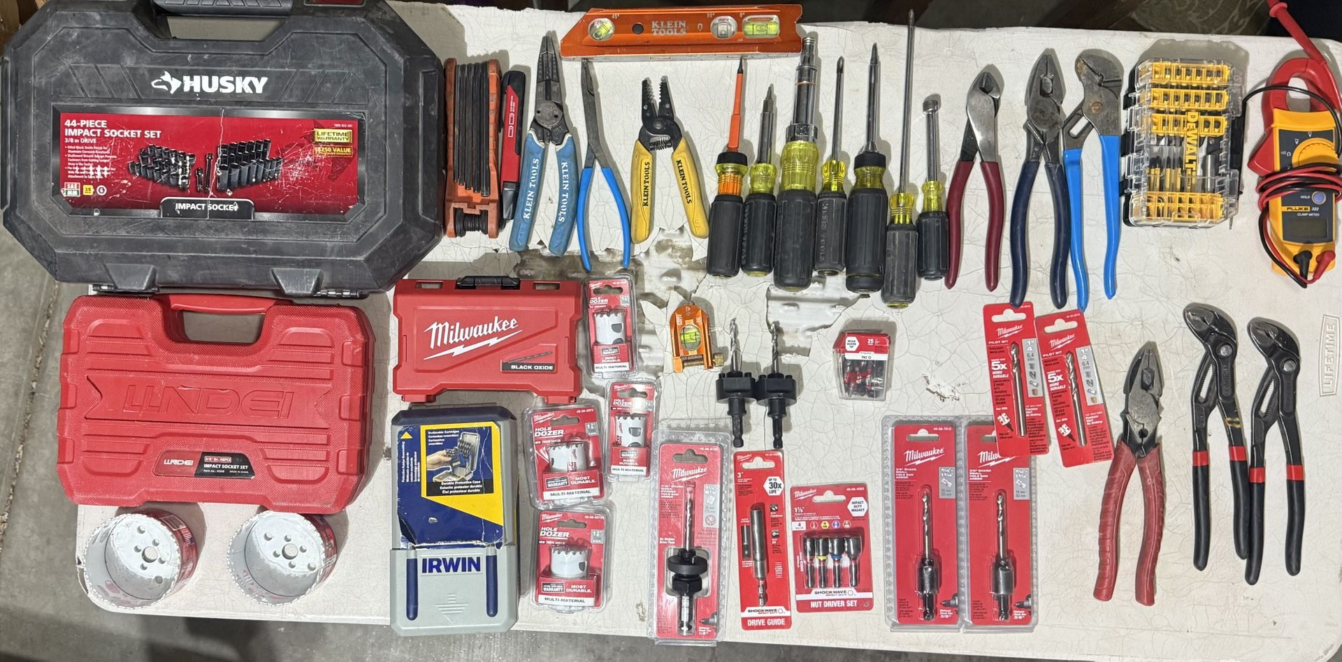 Various Klein hand tools, Meter, Bits, Attachments, socket sets, tool bags, etc. This is first come first serve. All tools are in great condition. I’ll give a fair price based off market price. Veto pro pac tech pac I’m asking $200. Small bag im asking $40. Meter I’m asking $100. All the other items on the table are gonna range from $10-$75. I’ll give bundle discounts.
