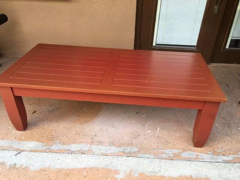 Solid wood bright cherry stain very heavy and solid could use TLC if you want not too many nicks in the wood. Any paint job and make it look like brand-new although it already looks new now. It's 4'10" width x 2'4" length x 1'6" 3/8 tall