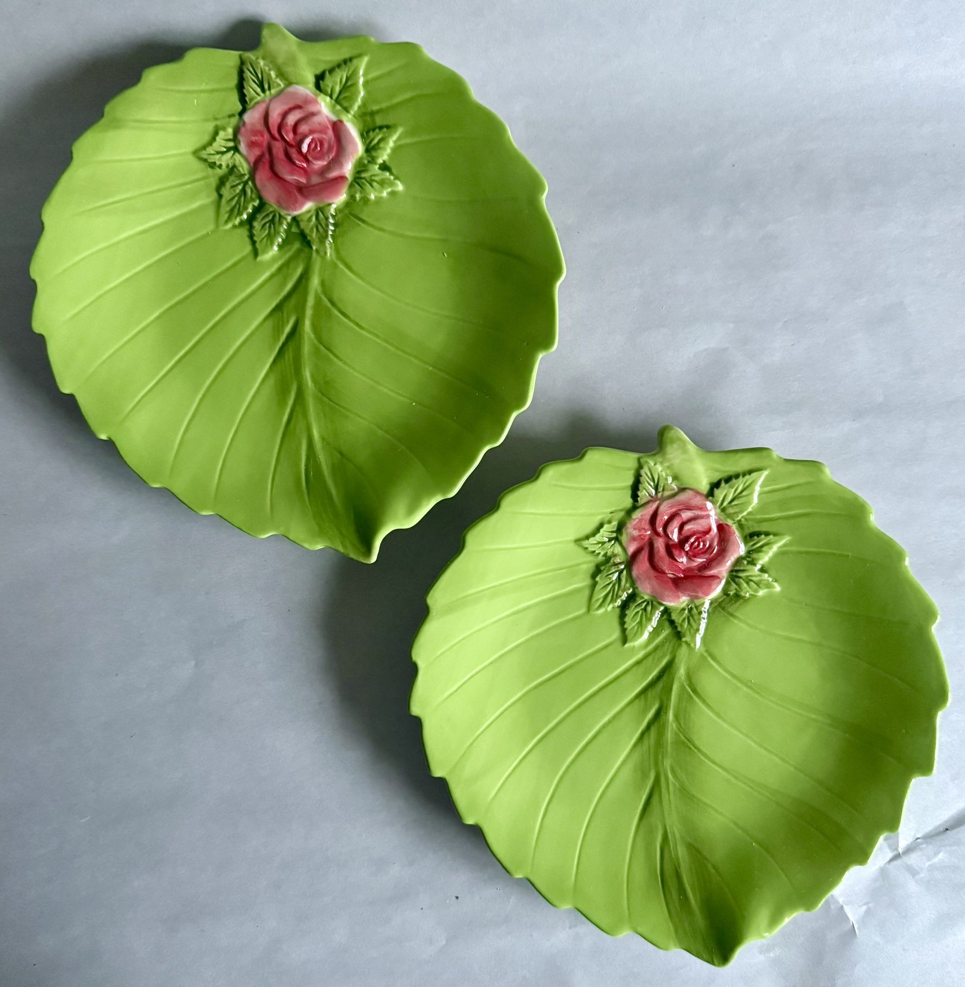 Two vintage Temp-tations by Tara leaf shaped plates with roses on the top. Both plates are in great vintage shape and do not have any major or obvious flaws/imperfections. There is a small chip on the back of one plate but it does not effect the form or function of the item. Little indication of previous use. Plates measure 8 inches in diameter.