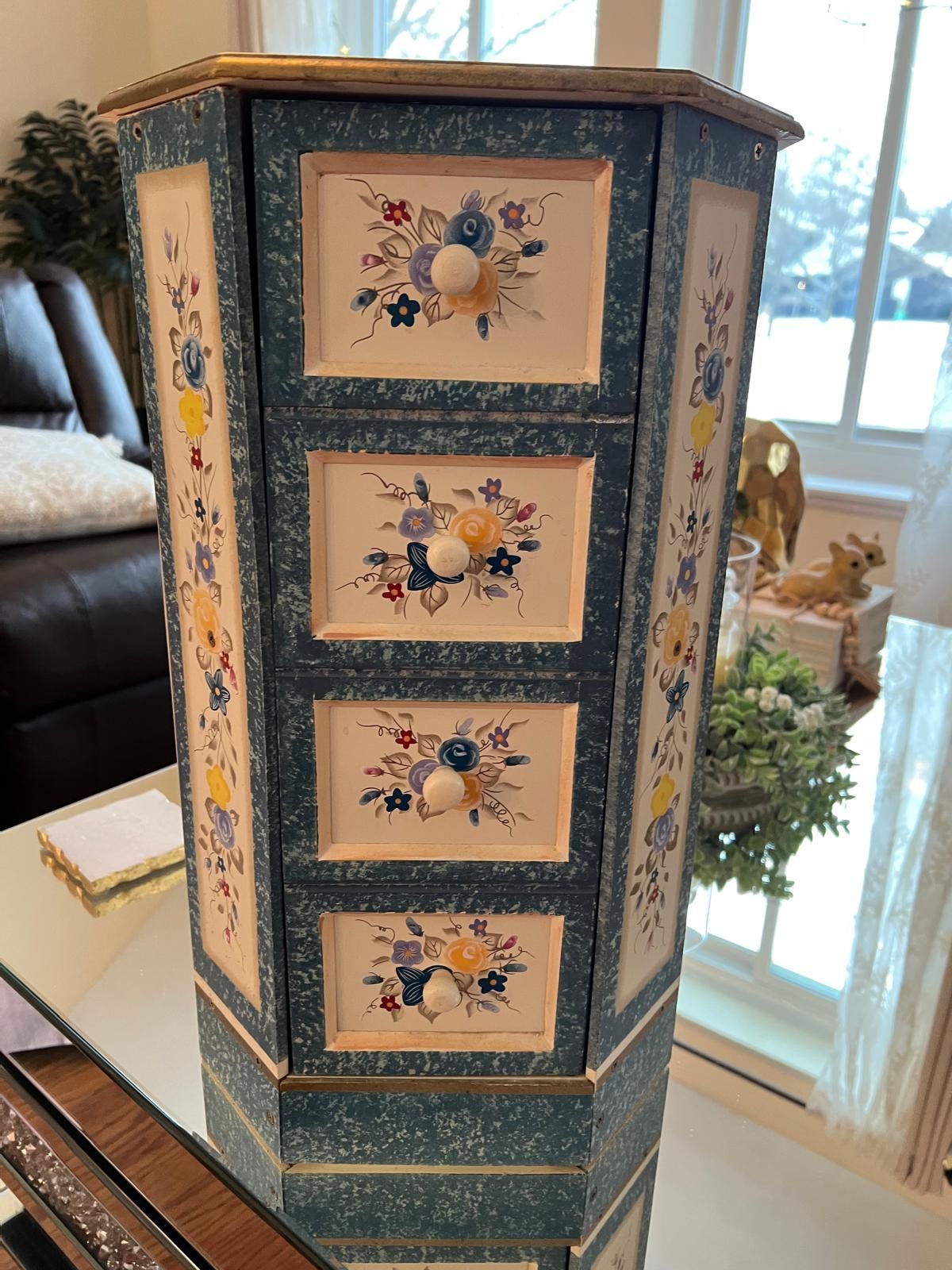 πΈ This beautiful vintage piece appears to be a 4-drawer jewelry box, but it is actually a hidden storage cabinet that opens when you pull the knob, revealing a shelf! Please see photo and video for reference. Dimensions: 20β H x 7β W x 11.5β L Perfect for a vanity, dresser, or tabletop display, blending functionality with decorative charm. The detailed artwork on all sides makes it stunning from every angle, whether used as storage or as a statement decor piece.