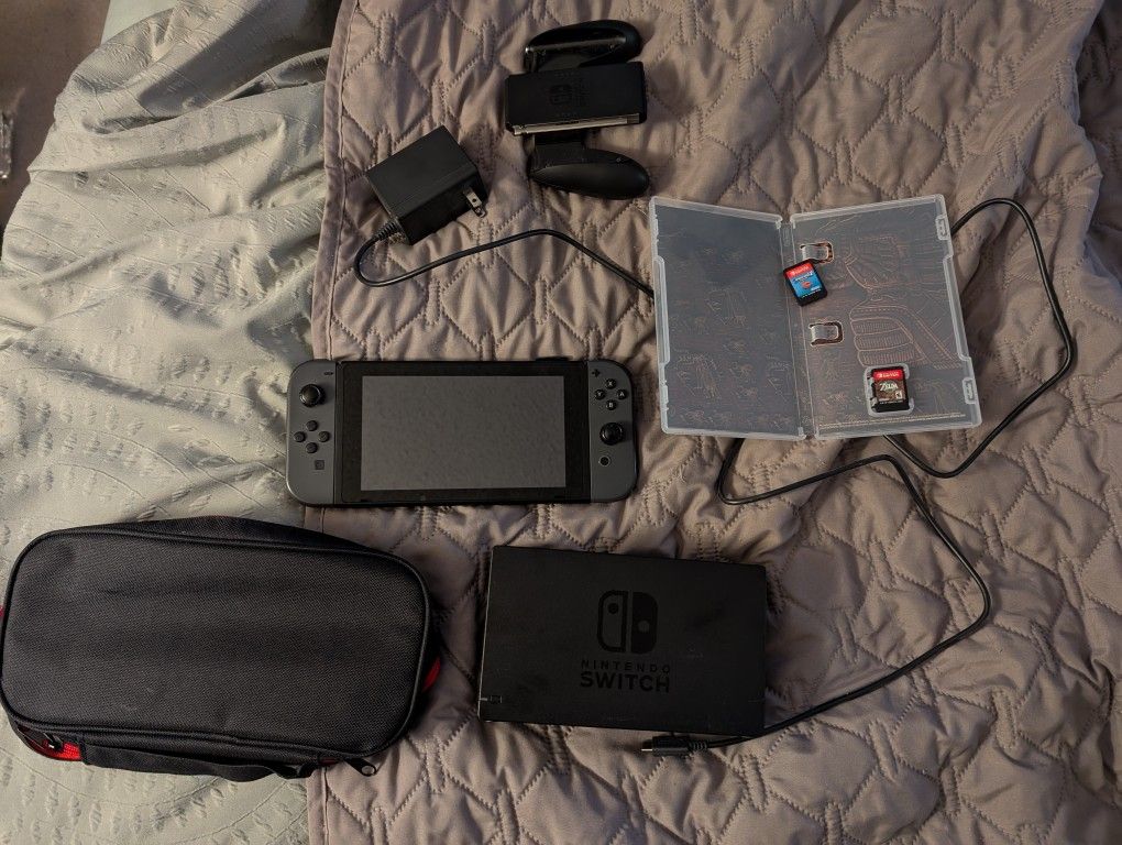 OG switch for sale, comes with everything in the picture and two games: Zelda Tears of the Kingdom and Advance Wars. The switch works great. Cash only