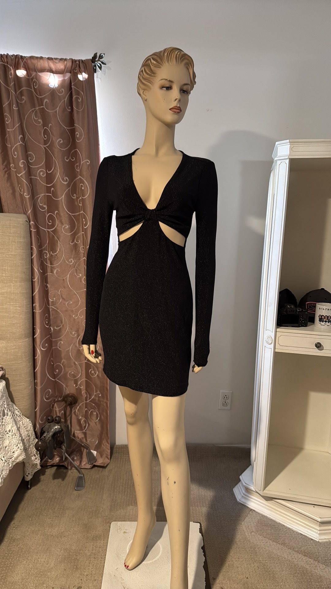 This elegant sleek black dress by Wild and Fable features stylish cut-out details, with a daring plunge neckline and long sleeves, perfect for a night out. Its bodycon style hugs your curves, offering a sophisticated and modern look. The minimalist design and smooth fabric make it a versatile addition to your wardrobe. Size S