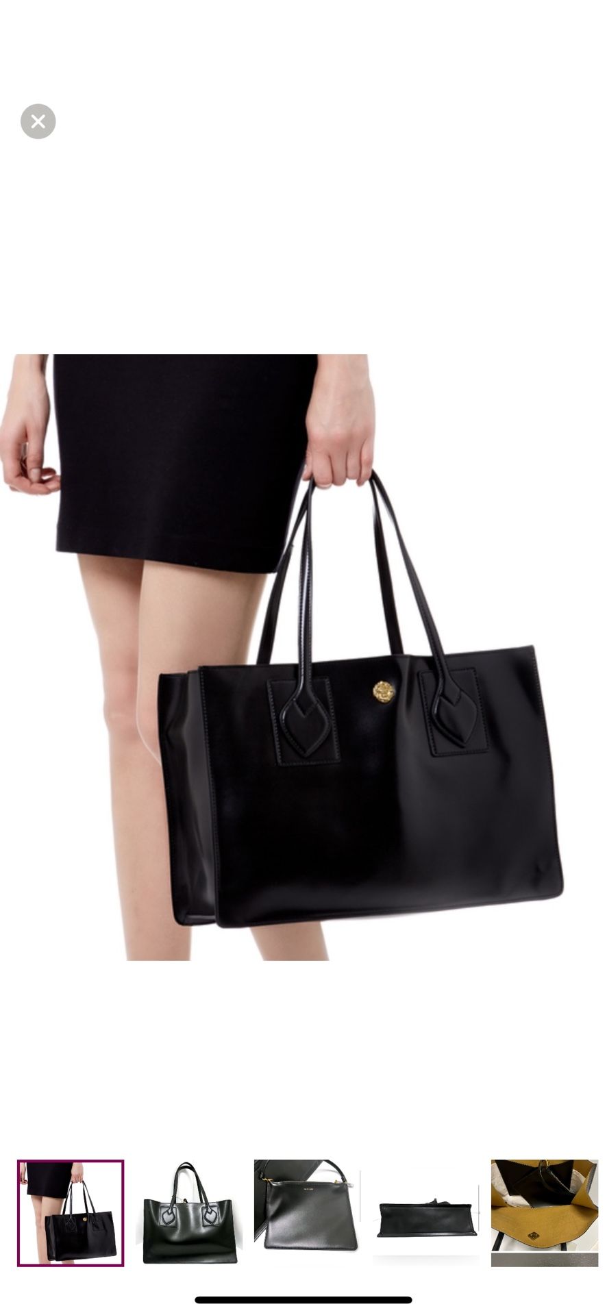 Anne, Klein, Amelia open tote! In black, vegan leather. Inside the bag has one large pocket and tan interior. Comes with a zip up matching wristlet. The measurements are Length 16 inches Height 11 inches Depth 5 inches Strap length 22 inches CALLOUT! Small scratch on strap (view last photo)