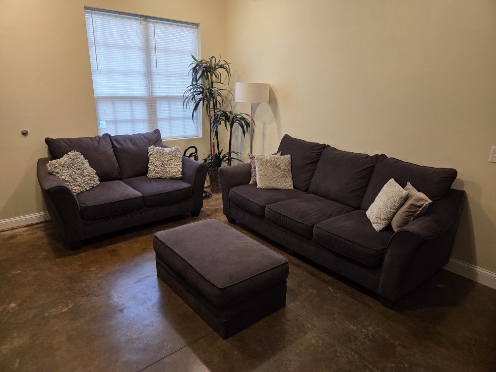 Selling a complete living room sofa set that I purchased from Weekends Only a few years ago. Includes: 3-seat sofa Loveseat Storage ottoman Several throw pillows, lamp, and plant included. All pieces are in great condition, very comfortable, and come from a clean, smoke-free home. No rips, no stains, no sagging cushions. The ottoman has built-in storage, perfect for blankets or games. Only selling because I’m moving.