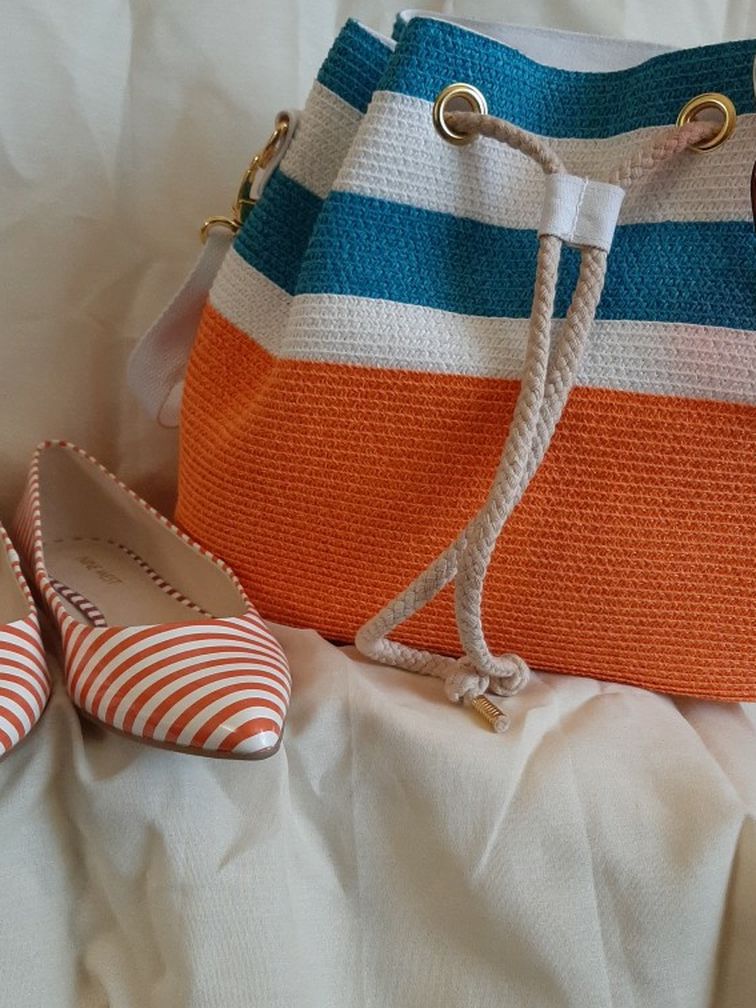 I'm ready for the summer by the looks of this gorgeous Large Satchel. Multi-color stripes, canvas straw brand new handbag. Ocean blue lining matching the blue stripe on the outside of the bag. Removable and adjustable crossbody white strap. This one won't last.