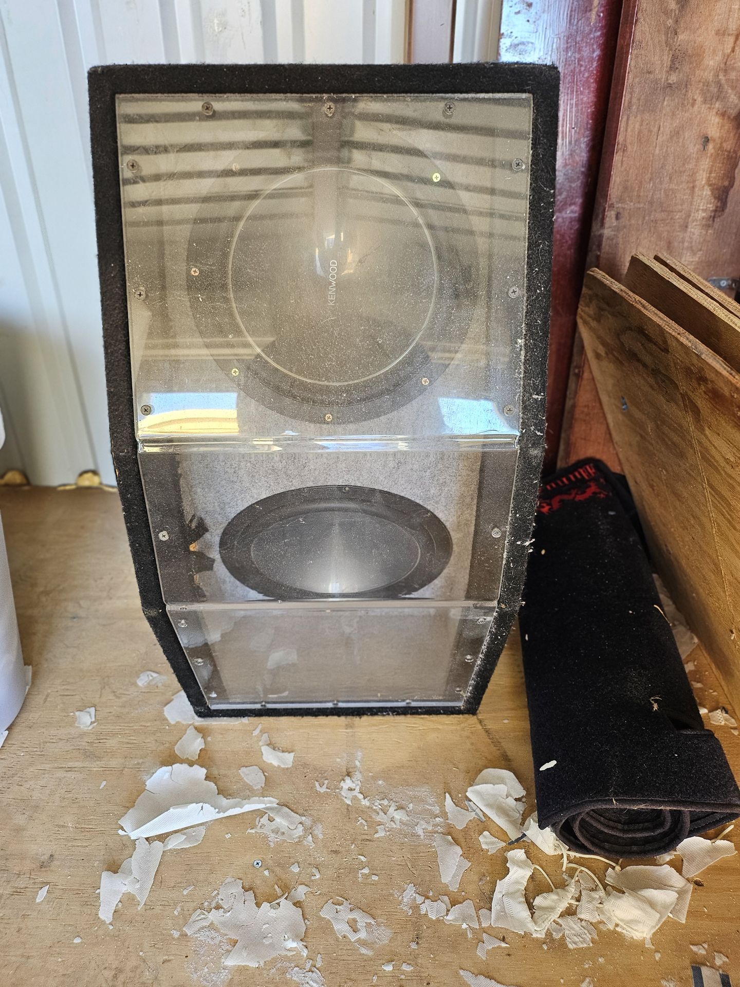 The box is angled and it has ported holes in it. It has two twelve kenwoods, just dusty.That's all but works great