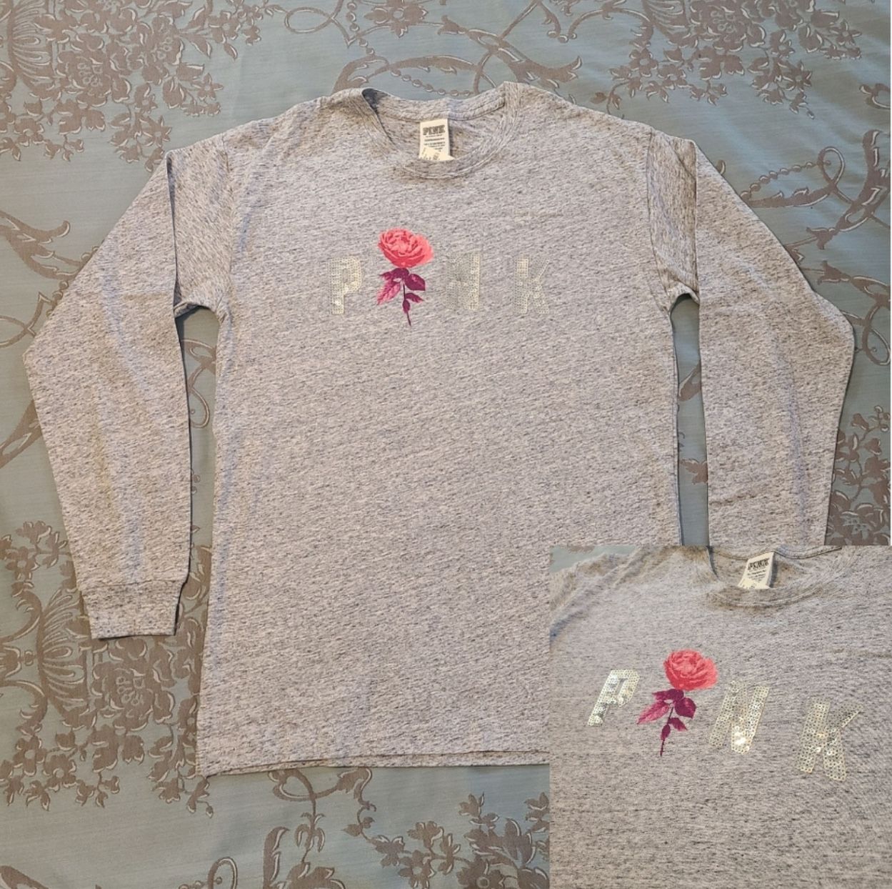 Victoria's Secret PINK Bling Long Sleeve Tee Shirt Heathered Gray Silver Pink XS