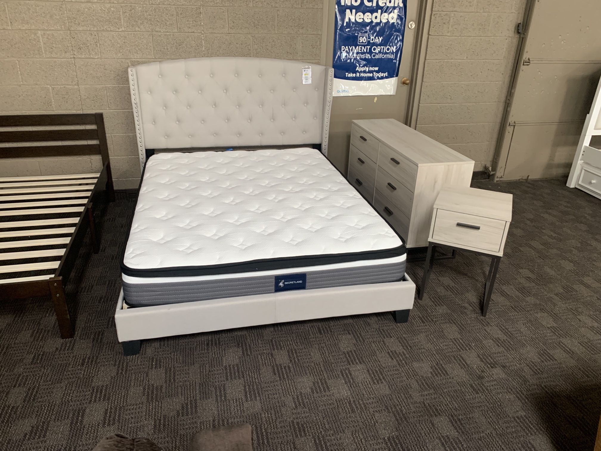 Brand new in box bedroom set. Queen size platform bed so no boxspring needed. Six drawer dresser and nightstand. Also available in full size Delivery and payment plans available