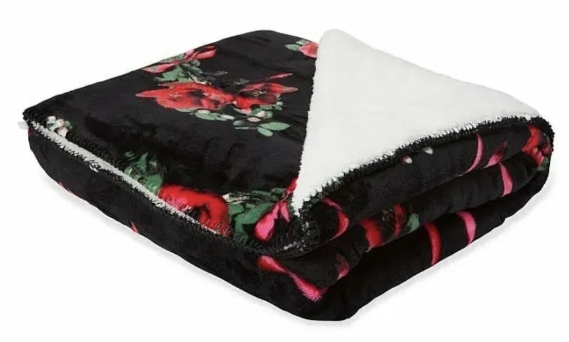Victoria’s Secret Black Floral Rose Sherpa Blanket New