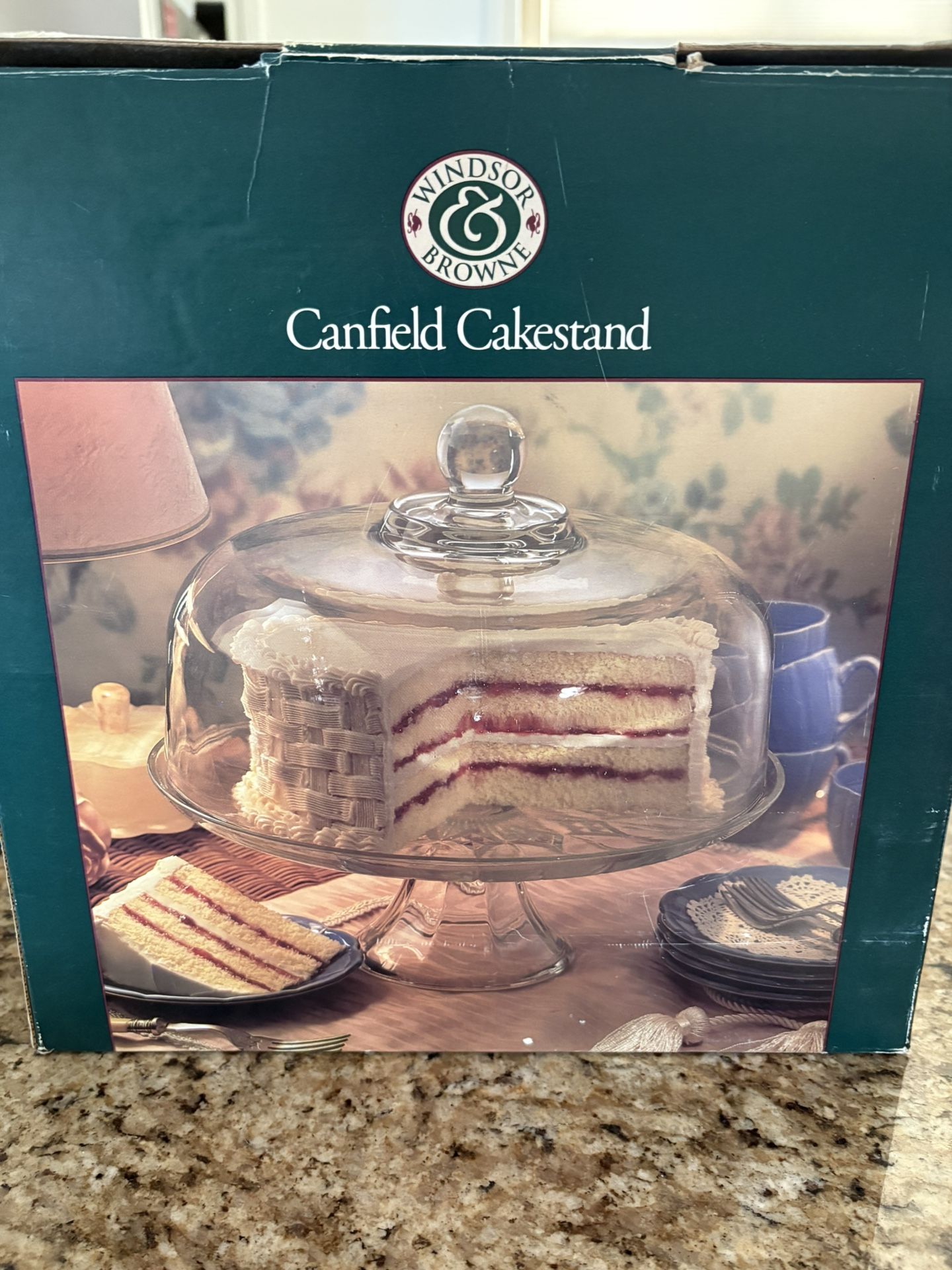 Glass cake stand with lid. In original box