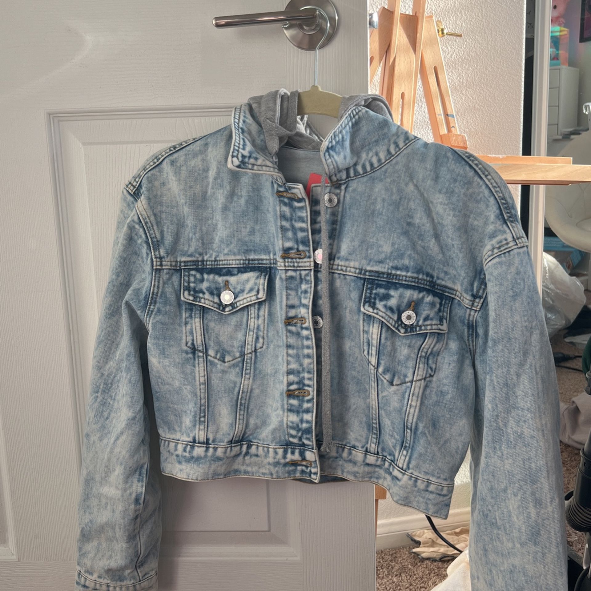 Never worn still has tags. Jean jacket with grey hood. You can detach hood if you’d like