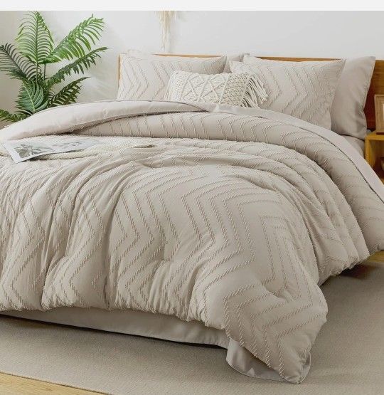 Litanika King Size Comforter Set with Sheets Beige - 7 Pieces Bed in a Bag King Chevron Tufted Boho Luxury Bedding Sets with Comforter, Sheets, Pillowcases & Shams