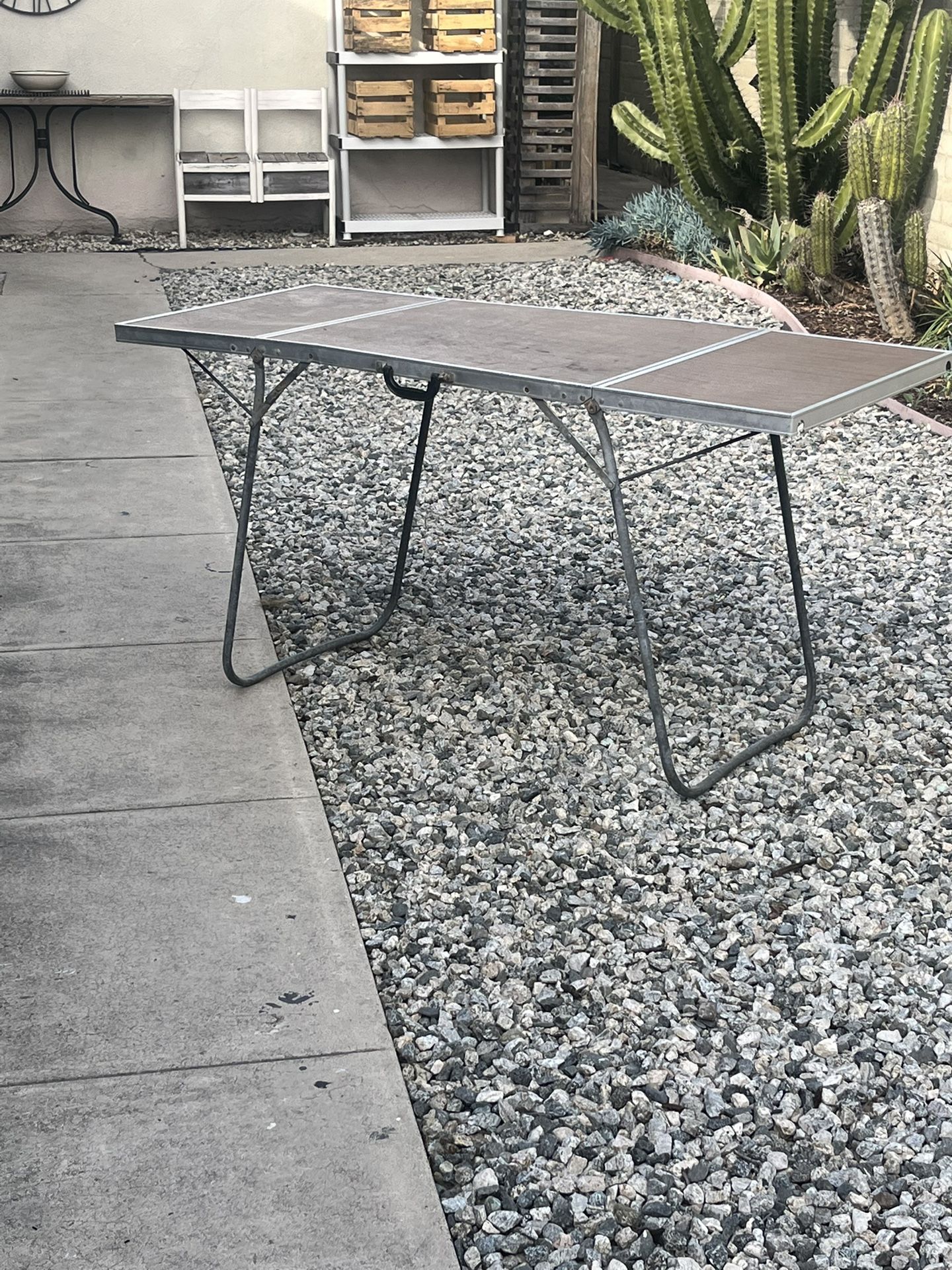 Vintage Falco Folding Camping Table w/ Leaves – Expands 30” to 60” (Suitcase Fold) ⸻ DESCRIPTION Beautiful vintage Falco folding camping / picnic table with a classic mid-century look and a super smart, versatile design. This table is one of those rare outdoor pieces that’s actually well-built, sturdy, and designed to travel — it folds into a compact suitcase-style form with a carry handle, making it perfect for camping, picnics, pop-up setups, vendor displays, or even as a cool vintage prop table. Sizes / Configurations • Stage 1 (compact): approx. 30” long x 24” wide • Stage 2 (one leaf open): approx. 45” long x 24” wide • Stage 3 (fully open): approx. 60” long x 24” wide • Folds into suitcase size: approx. 24” x 30” x 4” deep You can use one leaf at a time (left or right) or open both for the full length — extremely versatile depending on your space. Condition Good vintage condition with normal cosmetic wear consistent with age/use. Clean, sturdy, and fully functional. (Please see photos.)