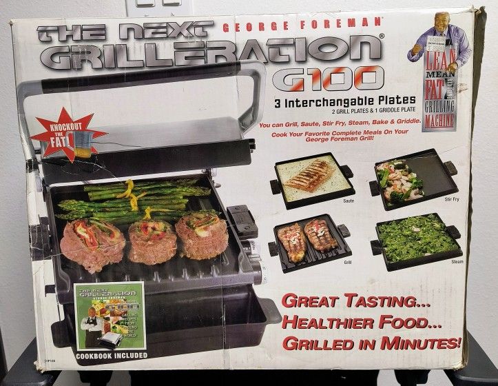 George Foreman Grilleration GRP100. NEW-in-Box. Stainless-steel countertop grill. 100-square-inch cooking surface. 1-1/2-inch floating hinge. 2 ribbed grill plates. 1 griddle/bake plate. Included Components: ... 2 customized spatulas. ... 2 grease-catching drip trays. ... Tongs. George Tough triple nonstick coating. Adjustable angle. Variable heat up to 425 degrees F. 30-minute countdown timer with signal bell. Measures approximately 19 by 15 by 10 inches