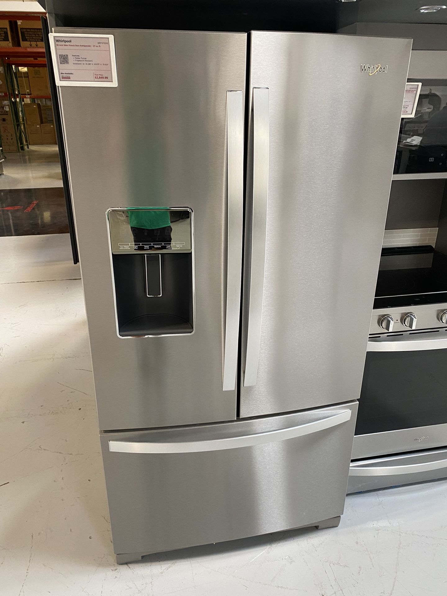 New Open Box Whirlpool Stainless Steel 36” Wide French Door Refrigerator Model #WRF767SDHZ Dimensions: 35.688”W 35.625”D 69.875”H Platter Pocket Fingerprint Resistant In-Door-Ice Storage Dual Ice Makers Includes a 12-month warranty Financing Available Delivery and installation available Contact us with any questions or to stop by to see this unit and others. Open Monday - Saturday 10am - 6pm Our inventory changes daily. Message us for availability.