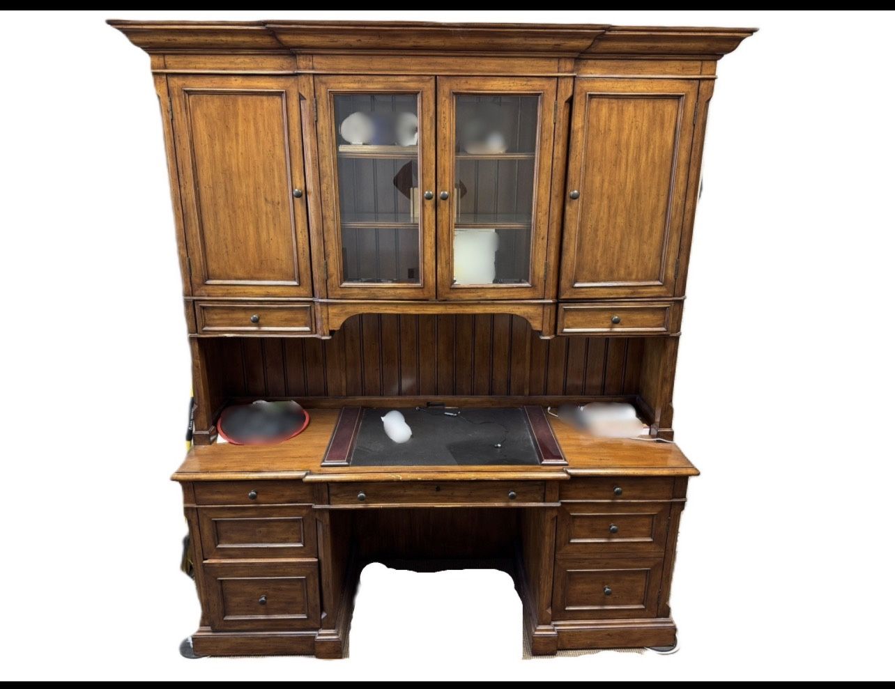 Taking offers for a beautiful solid wood executive desk with matching hutch/bookcase. This is a high-end, heavy, professional-grade office set — far superior to modern flat-pack or particle board furniture. Perfect for: • Home office • Law office • Therapy office • Business executive space • Study / library Features: • Solid wood construction • Large executive desk with multiple drawers • Matching upper hutch with cabinets and glass display doors • Built-in shelving and storage • Rich warm wood finish • Classic traditional design • Extremely sturdy and well-built • Tons of workspace Condition: Good overall condition with light cosmetic wear from normal use (see photos). Structurally excellent. All drawers and doors function properly. This is a statement piece that instantly elevates any office. Pickup only. Located in DeSoto, TX.