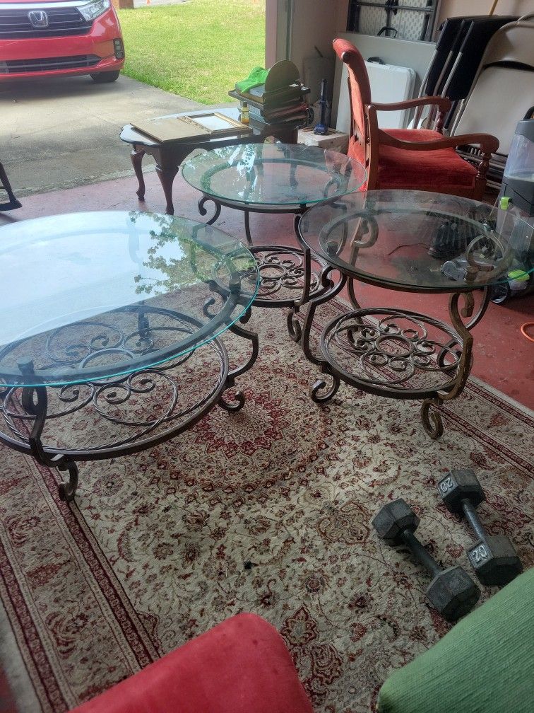 Complete set including main table and two side tables. We bought them on clearance for 200+ from the PX in Clarksville, TN in 2010 (way before inflation). Totally solid glass. Really not a bad set at all, it's just that we're doing away with most modern pieces. Now it is missing some screws (just go to Lowes or your garage probably even has some, or your wife's knick-knack drawer) and it needs a can of touch-up spray paint. No biggie. People restore things all the time. Paint 'em farmhouse for all I care. It may not look as nice because I took the pictures in the garage, where they are stored. Oh well.....