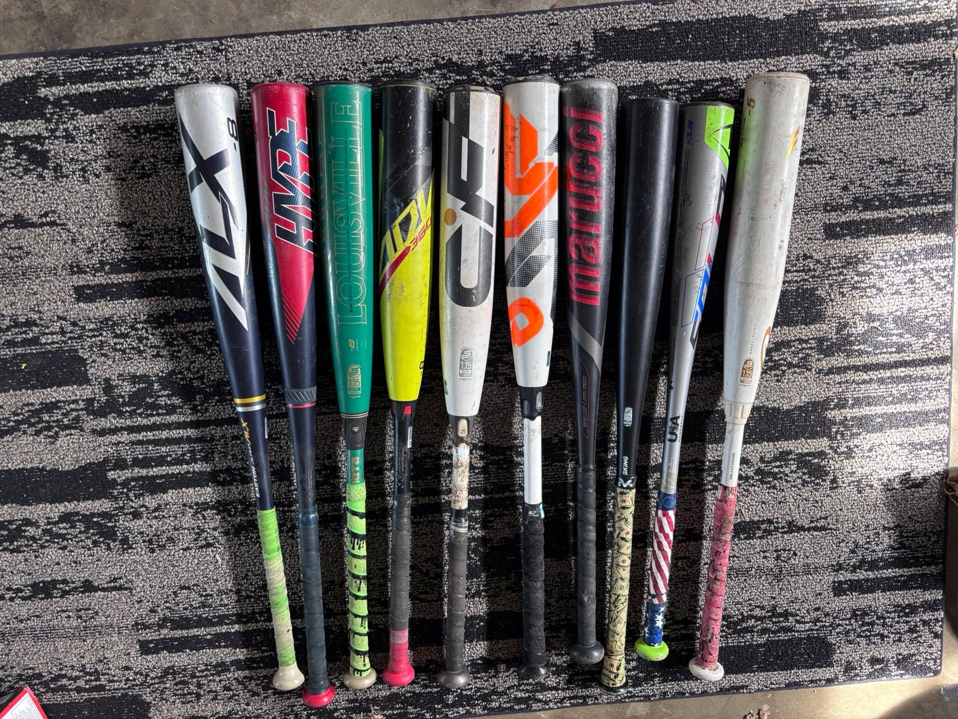 I have many different sizes available! USSSA and USA bats. No set prices, make me an offer! From left to right: USSSA EASTON ALX 30in drop 8 USSSA EASTON ADV HYPE 31in drop 8 USSSA Louisville Slugger Meta 30in drop 8 ***USA EASTON ADV 360****SOLD**** USSSA Demarini CF 30in drop 8 USSSA Demarini CF 30in drop 5 USSSA Marucci Cat 9 29in drop 10 USSSA Stringking 30in drop 10 - great for cages or games USA Louisville Slugger Solo 28in drop 13 - great for the little ones USSSA Rawlings Icon 30in drop 5 - rattles a little but still has great pop