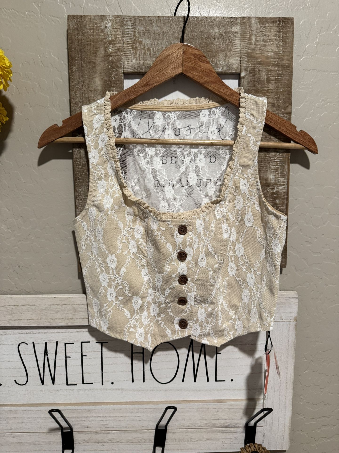 The Cider Lace Vest Button Up in size XXS offers a whimsical and cottage-like vibe, perfect for casual occasions during the summer and spring seasons. This sleeveless button-up top in beige color features delicate lace accents, adding a touch of elegance to the piece. Made by the brand Cider, this machine washable vest is a fashionable and stylish addition to any woman's wardrobe, ideal for those looking for a unique and feminine look. Cider Lace Vest Button Up New With Tags Sz XXS Womens Runs bigger in my opinion Ptp is about 15” Length is about 16-17” Yes it’s available pickup in buckeye off watson and yuma