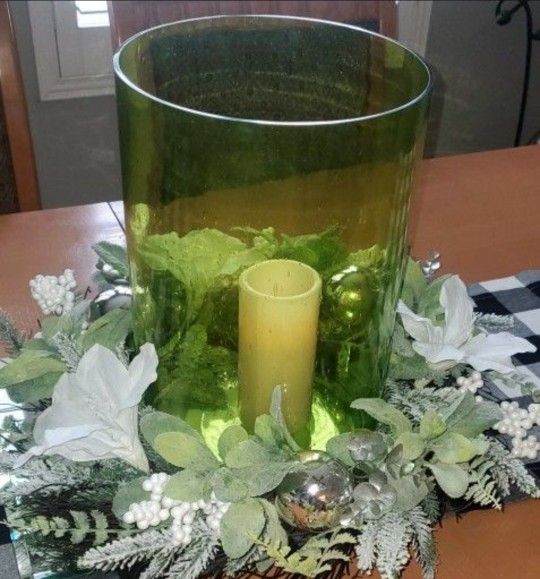 Xl recycle green glass hurricane $25 ea or 2 for $40 ( Wreath & candle NOT included) just put inside your fav wreath for xmas, Fall or Spring Reg $69 ea for indoor/ outdoor use