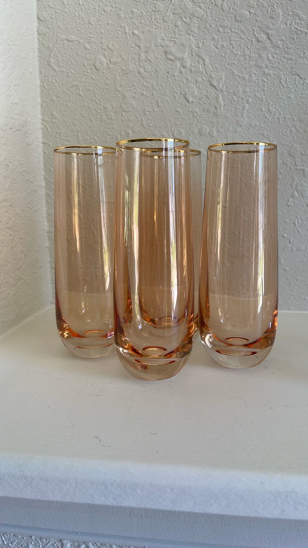 DESCRIPTION The perfect accessory to dress your table and spark up meaningful moments with vintage glassware and drinkware. If you are looking for the perfect barware, wine holders or cocktail shakers to cocktail mixing sets you have come to the right place. These are perfect poolside glasses! CONDITION Original Condition Unaltered DIMENSIONS: Vintage Mid Century Blush Pink Gold Rim Champagne Flutes Set of 4 Dia- 3” W- 3.5” H- 7”