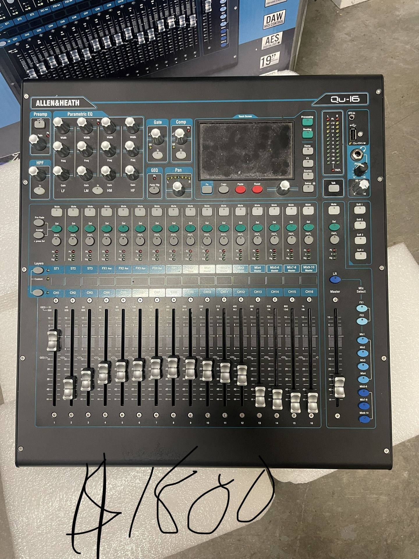 Condition: Excellent Condition This is the ultimate compact, rack-mountable digital mixer for live sound, studio recording, and installation. The Silver/Chrome edition has a standout, professional finish and features the improved tactile controls (compared to the original black models). The Qu-16 is renowned for making the transition from analog to digital seamless, thanks to its intuitive "One Channel / One Fader" layout and the responsive True Colour Touchscreen. • Premium AnalogiQ™ Preamps: Get that signature, high-quality, warm, and musical Allen & Heath sound with ultra-low noise. • 17 Motorized Faders: Automatic recall for scenes and mixes (including monitoring mixes) makes setting up for different acts or bands lightning-fast. • Built-in Multitrack Recording (Qu-Drive): Record 18 channels of 24-bit audio directly to a USB hard drive—no computer needed for capturing live shows! • Complete Processing & FX: Comes loaded with high-quality Gates, Compressors, 4-Band Parametric EQs, and 4 onboard iLive FX engines (Reverbs, Delays, etc.). • Flexible I/O: 16 Mic/Line inputs, 3 Stereo inputs, and 12 Mix outputs. It's ready for any small to medium-sized gig or studio session. • iPad Remote Control: Full control over your mix from anywhere in the venue via the dedicated Qu-Pad app. Perfect for: Bands, Houses of Worship, Small Venues, Recording Studios, and corporate A/V.