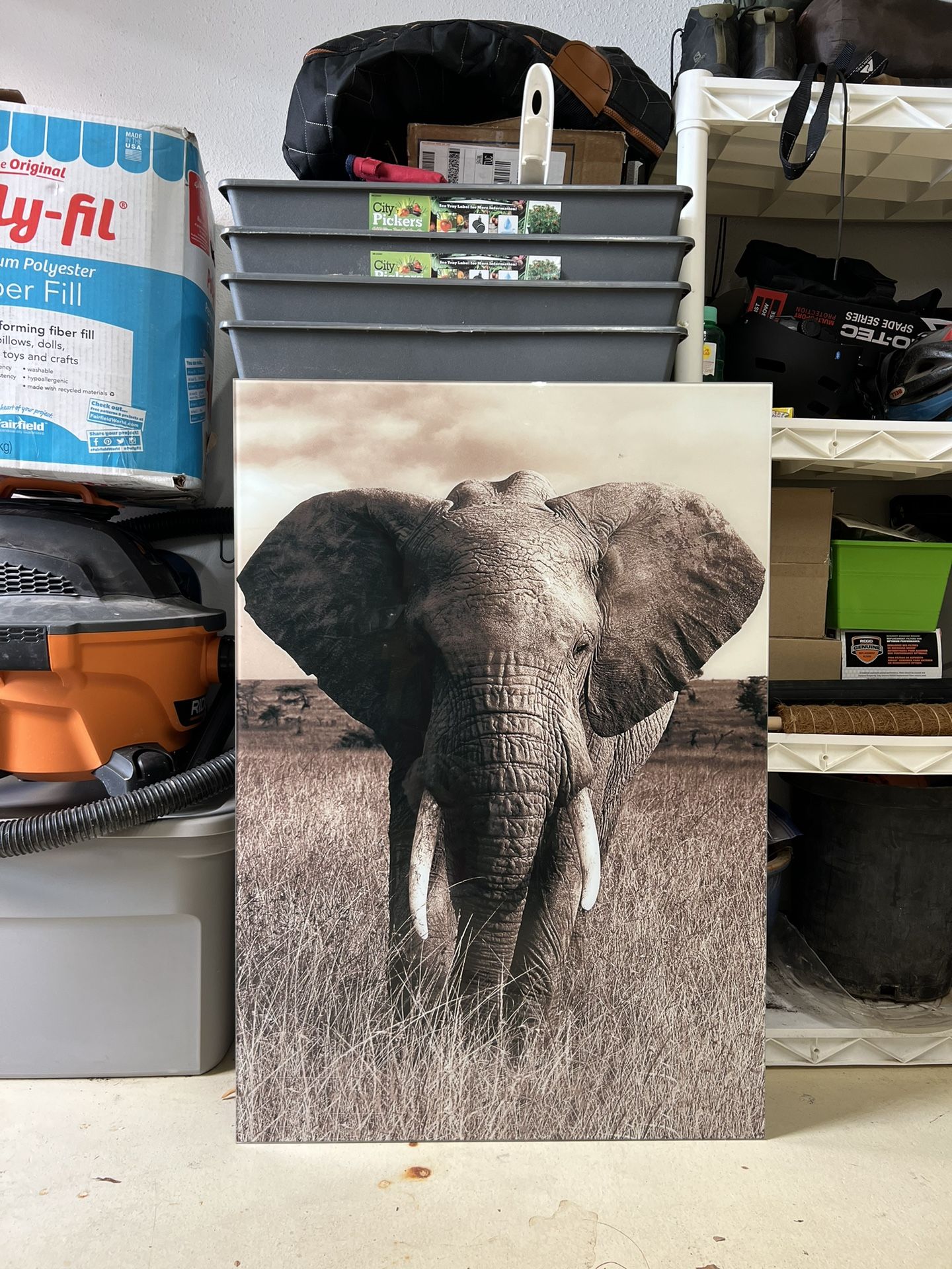 Large glass with sepia elephant photograph, can be hung on a wall. Gently used, like new.
