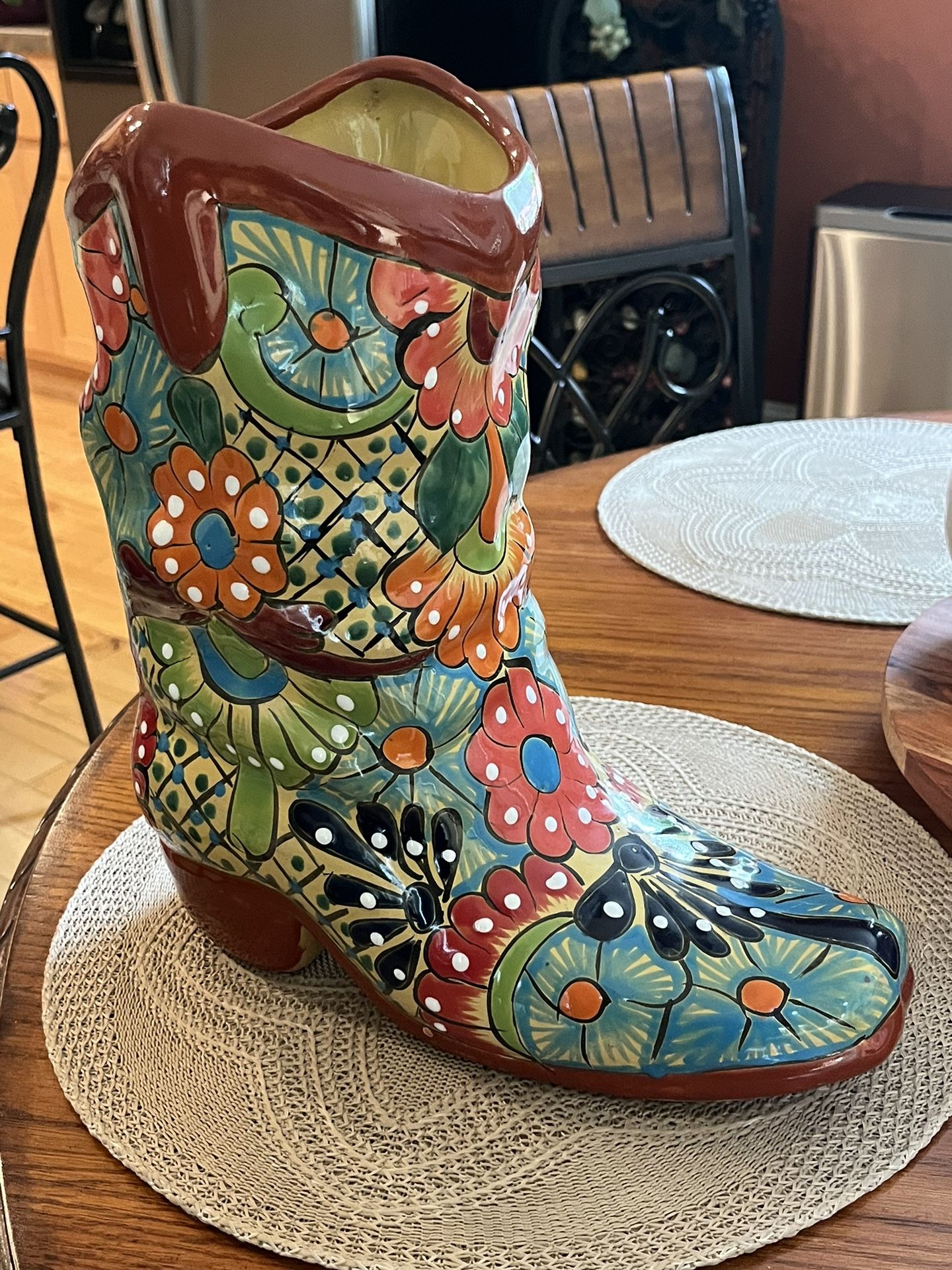 Glass boot bought in Texas, used as decor. No chips, just down sizing