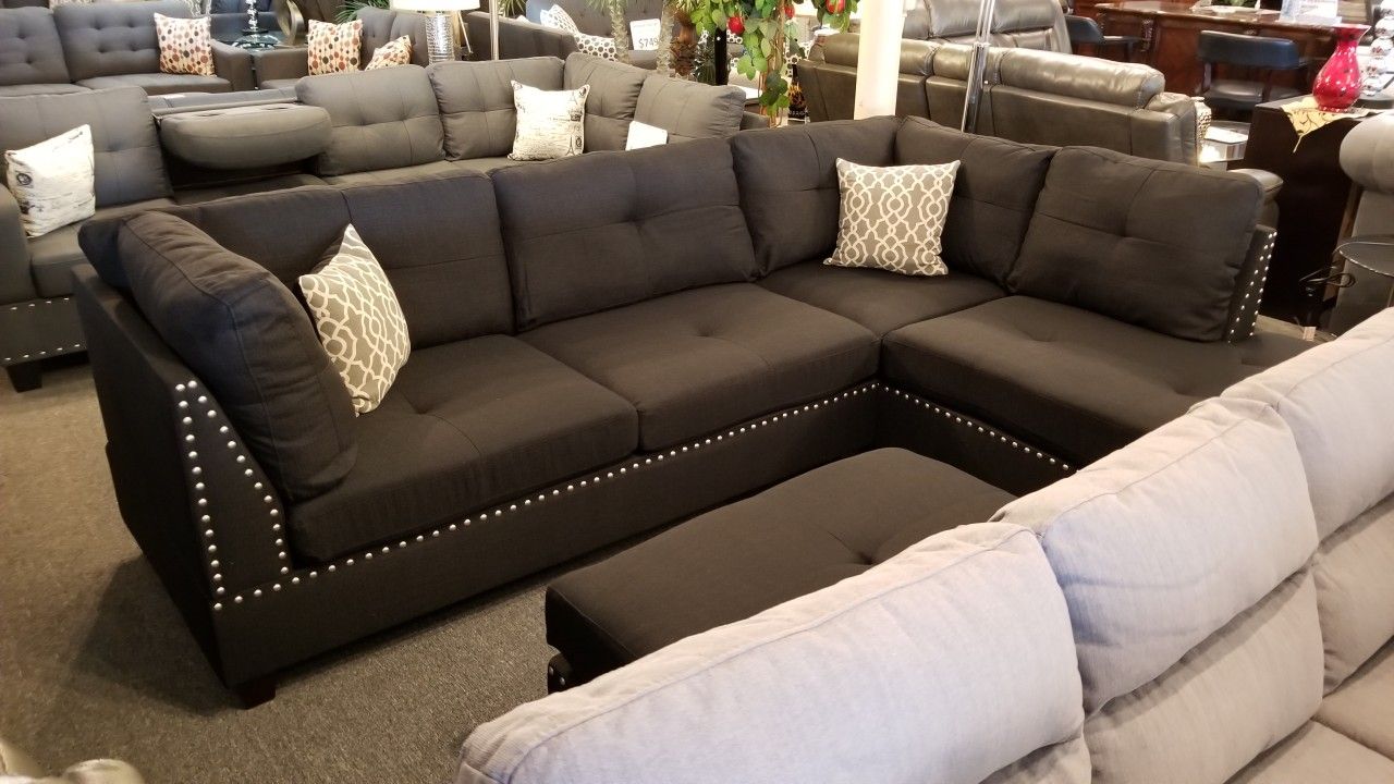 Brand New 104" x 75" Black Fabric Reversible Sectional + Ottoman