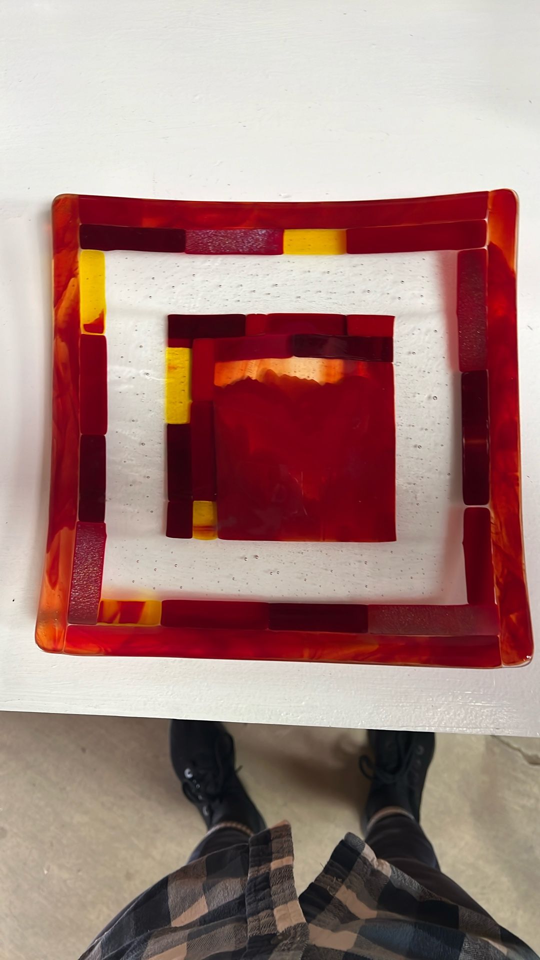 Approx 9.75” square. Handmade plate