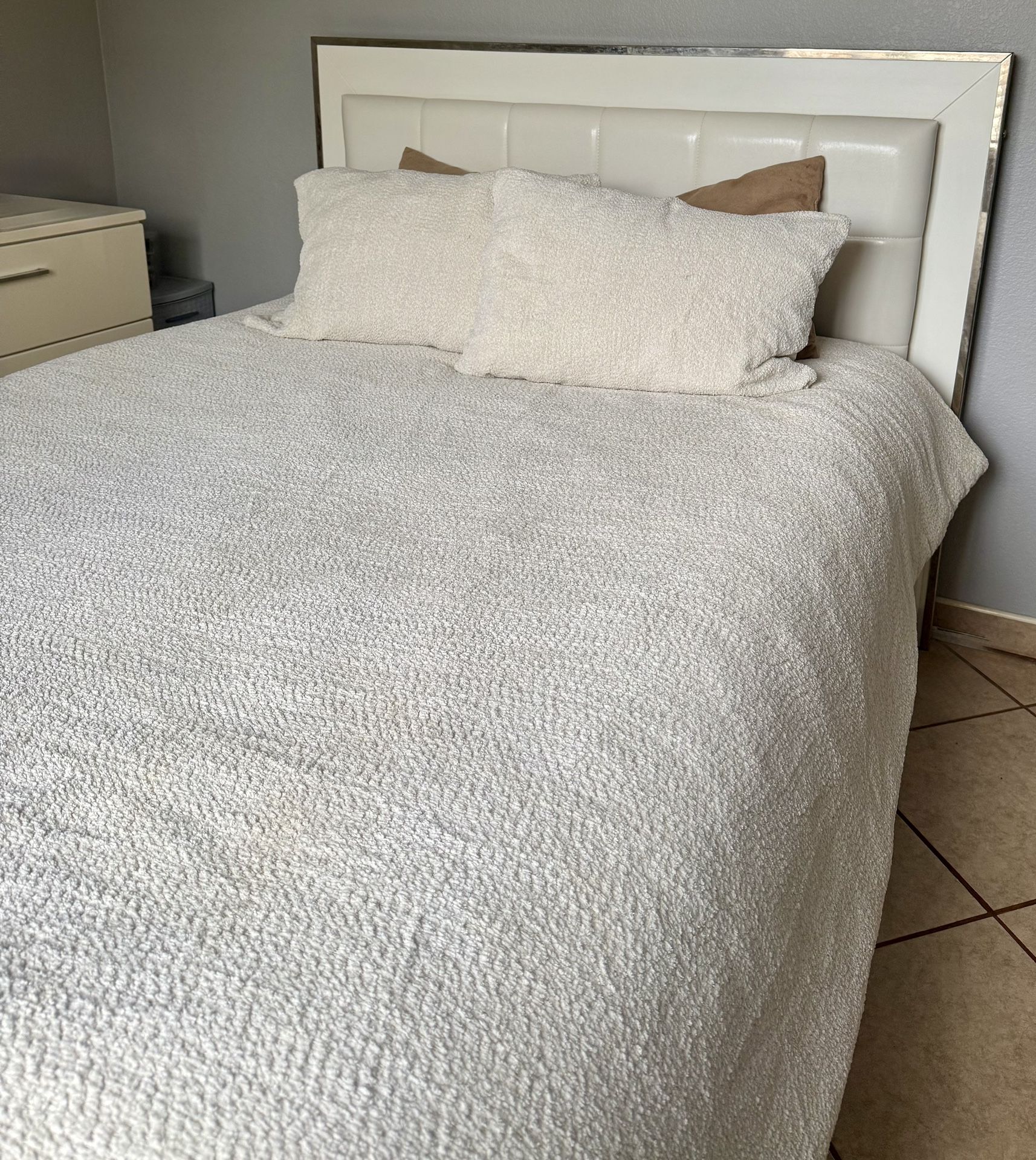 Queen bed frame with box spring (mattress not included). White dresser with mirror (not pictured). Cama tamaño queen con base de colchon (no incluye colchon). Aparador blanco con espejo (el espejo no aparece en la foto).