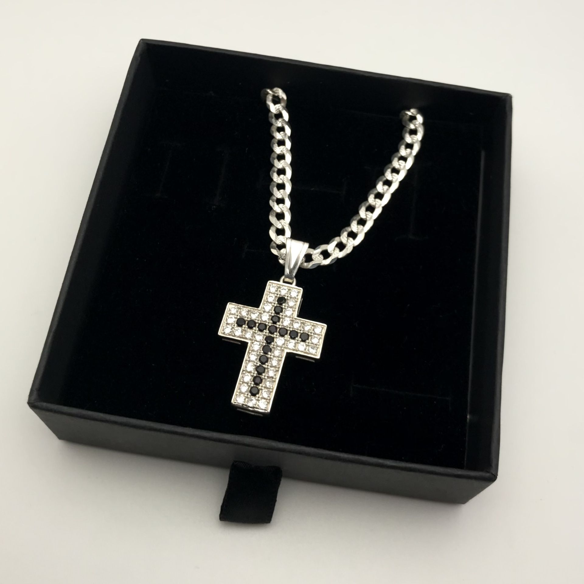 This black and white CZ cross pendant is crafted from 100% solid 925 sterling silver and paired with a 24-inch 5mm diamond-cut Cuban chain. The contrast of black and white cubic zirconia creates bold dimension while maintaining the timeless symbolism of the cross. The 5mm Cuban chain adds noticeable presence and shine, making this a strong everyday statement set. Details • Material: Solid 925 Sterling Silver (not plated or filled) • Stones: Black & White Cubic Zirconia • Pendant Design: Cross • Chain Style: Diamond-cut Cuban • Chain Width: 5mm • Chain Length: 24 inches • Finish: High-polish silver • Condition: Brand New • Origin: Handmade in Guadalajara, Mexico Handcrafted in our family workshop using genuine sterling silver for durability, weight, and lasting shine. Send an offer!