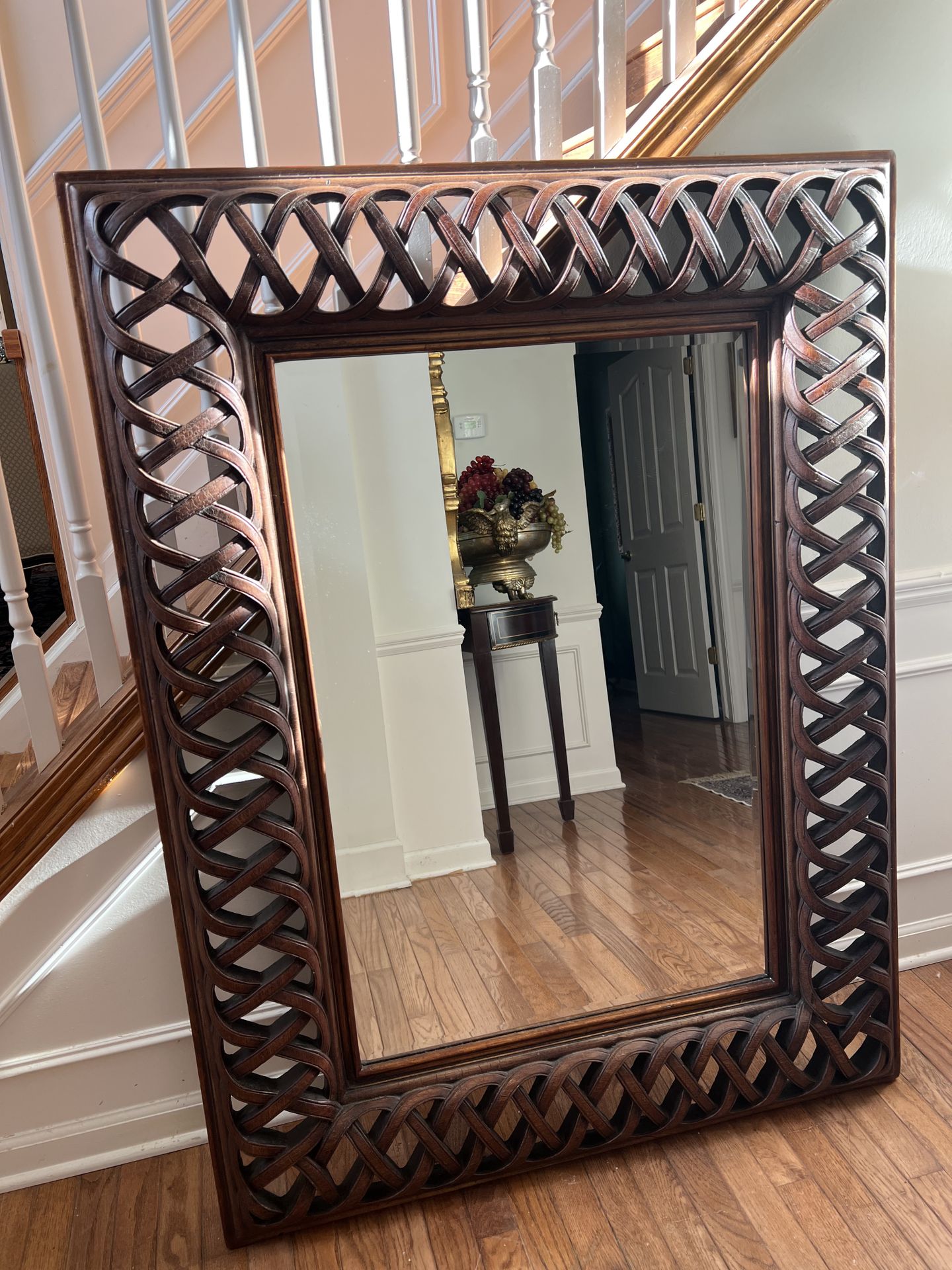 A beautiful large mirror with designed frame and beveled edge mirror approximately 52” by 40” can be mounted both ways in excellent condition paid over $200 downsizing asking only $30!!
