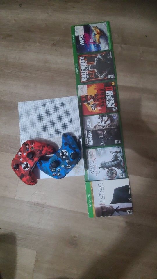 Xbox 1 S for sale -Comes with games-Need for speed heat, Hitman Steelbook Edition, Assassin Creed Remastered, Red Dead Redemption 2, Call of Duty Black Ops 3, Tom Clancy's Rainbows Six Siege -Controllers