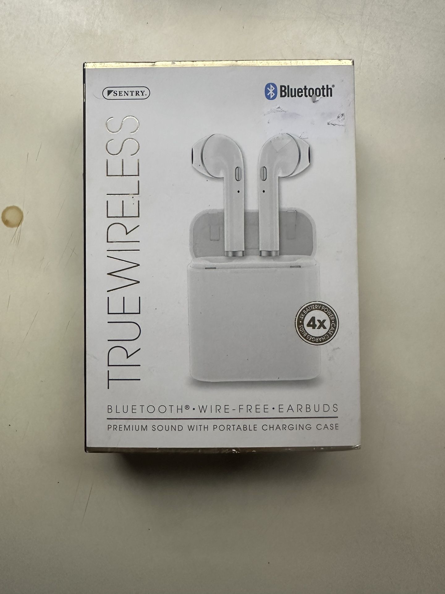 Selling unused true wireless earbuds with optional silicon earpieces and a portable charging case. Features built in mic, touch control buttons to play/pause and answer calls, 30 ft Bluetooth range, 10mm drivers.