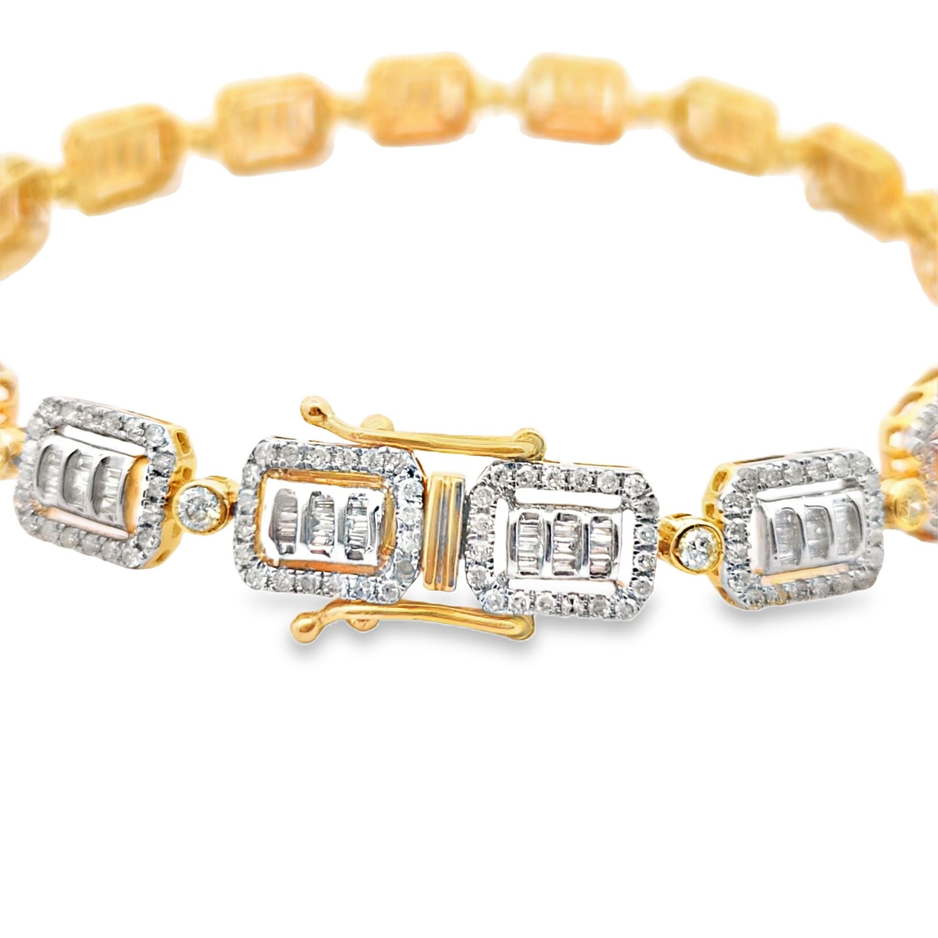 Elevate your style with this exquisite yellow gold chain bracelet. Showcasing a series of meticulously arranged, step-cut baguette diamonds, the design exudes sophistication. The brilliant colorless diamonds are set within a halo adding a touch of glamour, making it a perfect accessory for both formal occasions and everyday wear.
