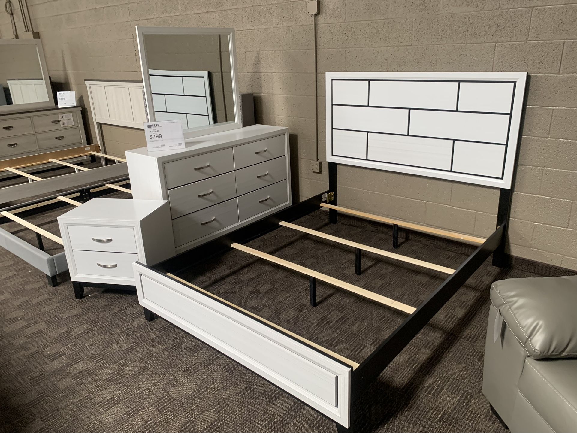 Brand new in box bedroom set. Queen size platform bed so no boxspring needed. Six drawer dresser and nightstand. Also available in full size Delivery and payment plans available