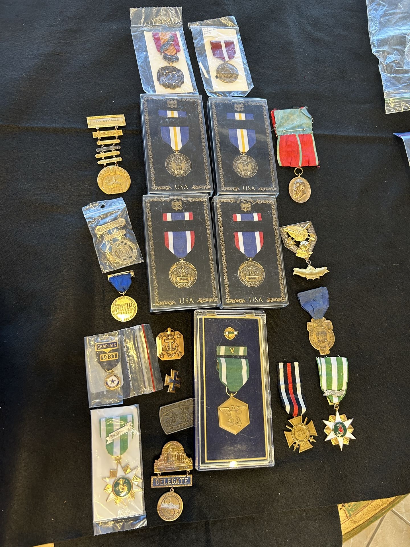 This collection of approximately 200 items includes Military ribbons, medals, pins plus political items. All are in very good condition many in the original box. $650 obo