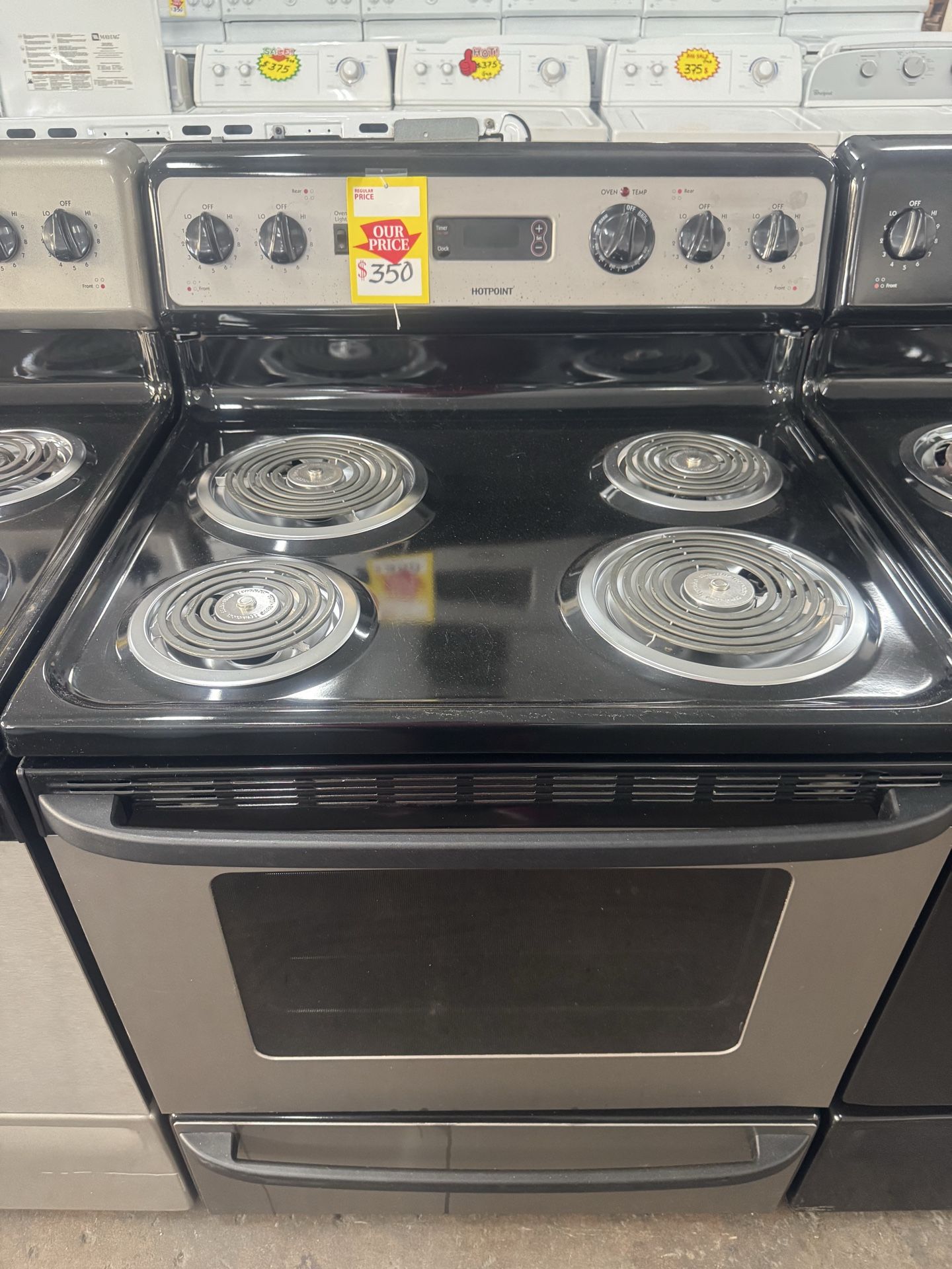 Used good conditions HOTPOINT 30” electric coils stove 220 volts black and grey color Working good 90 days warranty We offer delivery and installation for extra charge