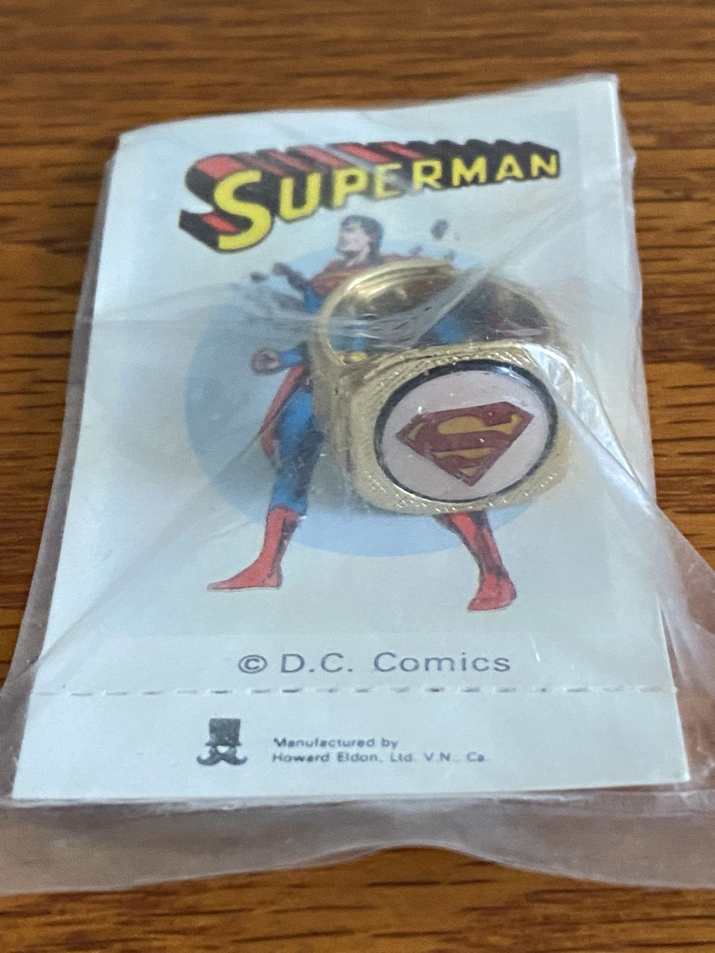 This is a Supermaan Nestlé ring from 1976 and is very rare. It has never been taken out of the package. It is a gold tone ring and adjustable.