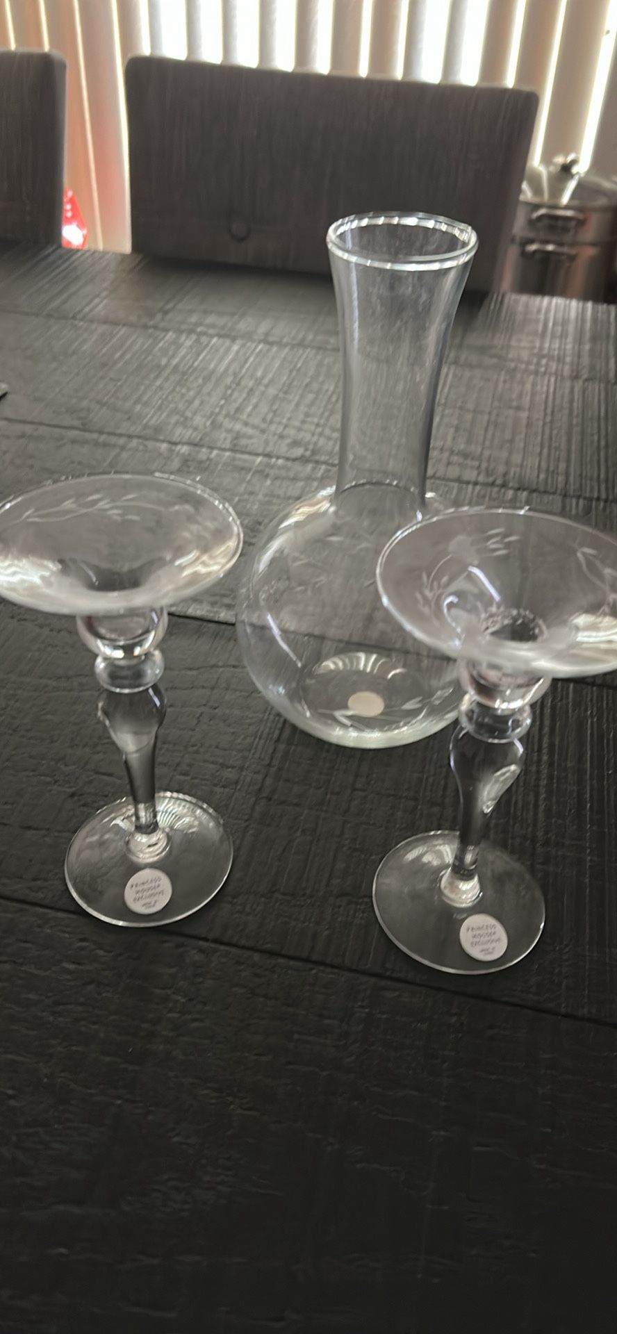 This is a Princess House Heritage etched crystal wine carafe or decanter set. The set includes a large, rounded carafe and two matching candleholders, all featuring the signature etched floral design. The items are made of clear glass or crystal. The carafe is typically used for serving wine, water, or other beverages. The Heritage collection is a well-known, vintage line from Princess House.