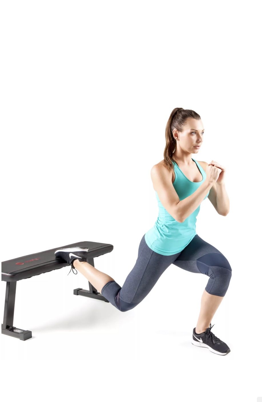 FEATURES: Flat bench for back, ab and free weight exercises Constructed of 1.25" x 2.25" square heavy-duty 14-gauge steel tubing Durable powder coated finish for long-lasting quality and durability Comfortable, high-density foam back pad with boxed upholstery Compact and easy to assemble frame design Maximum User Weight: 300 lbs Assembled Dimensions: 41” L x 12” W x 17” H Product Weight: 21 lbs