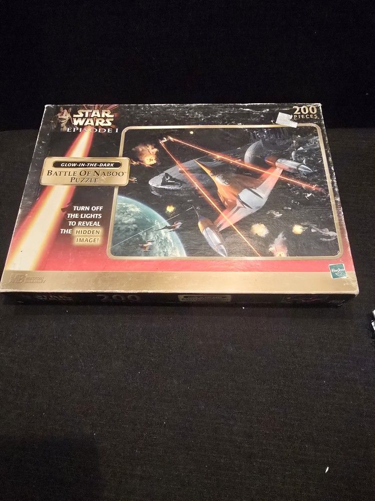 Star Wars Episode 1 200 piece Puzzle. Never Opened Original Box sealed, Battle of Naboo ,Glows in Dark Turn off lights to reveal The Hidden Image Damage to Box and price tag left on Box Take a look at pics