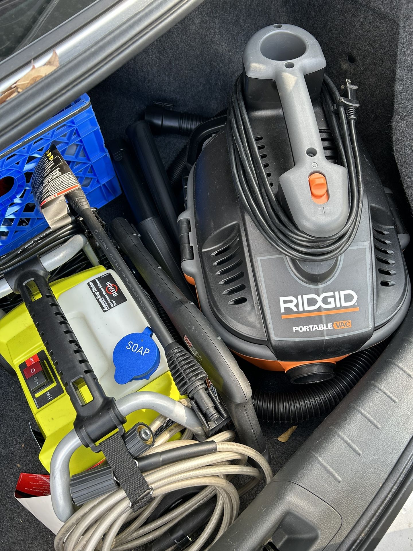 Only used for 5 details then I upgraded so there’s a ton of life left to the equipment Comes with: •ryobi 1900 psi pressure washer ($200) •ridgid 5.0 hp 4 gallon portable vac ($100)(SOLD) •professional grade foam cannon ($80)(SOLD) •continental 50 foot hose (new)($50) •50 foot extension cord ($20) •Bottle of super clean and meguires gold class(used) •36 microfiber towels(new)($15) •heavy duty pump sprayer and spray bottles ($25)(SOLD) •wheel and tire cleaning brush kit($20)(SOLD) •analan pet hair cleaner ($15)(SOLD) •chemical guys leather cleaning brush($10)(SOLD) •chemical guys interior cleaning brushes ($10)(SOLD) •armor all mini duster($5)(SOLD) Prices on the side are how much i bought it for so it’s 550 dollars worth of stuff