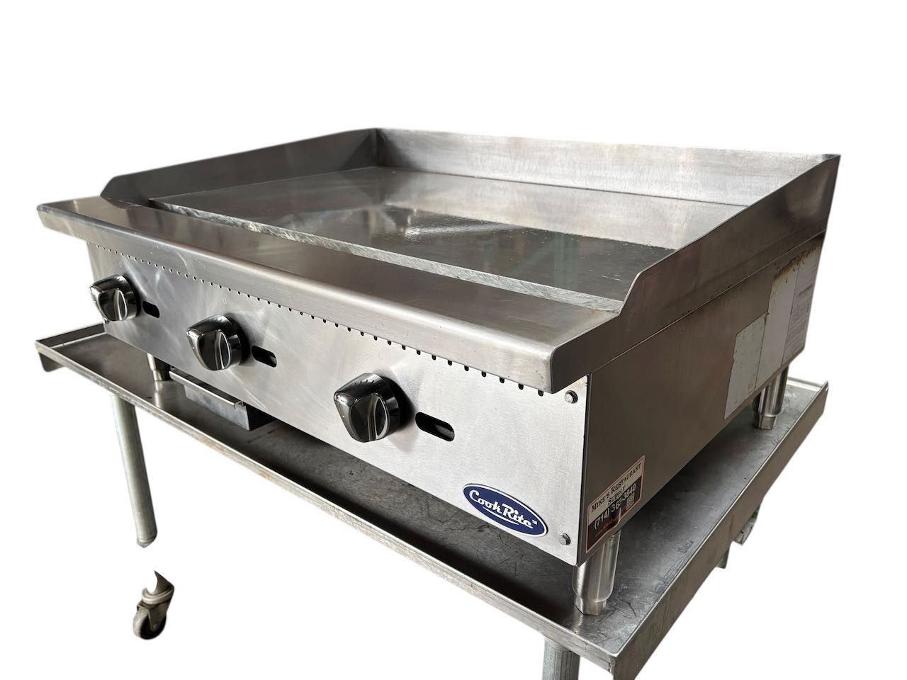 36" Manual Griddle Plancha Flat Top Grill 3/4" Thick Polished Plate Atosa Cookrite ATMG-36 #4310 Stainless steel exterior and interior Stainless steel grease drawer Heavy duty 3/4” thick polished steel griddle plate 30,000 BTU burners per 12” section with standby pilots Independent manual controls for each 12” section Stainless steel legs standard 3/4” NPT rear gas connection and regulator standard All electronic parts are CE certified NSF Rated 36W x 28.6D x 15.2H 3 Burners, 30,000 BTU Per Burner, Total 90,000 BTU
