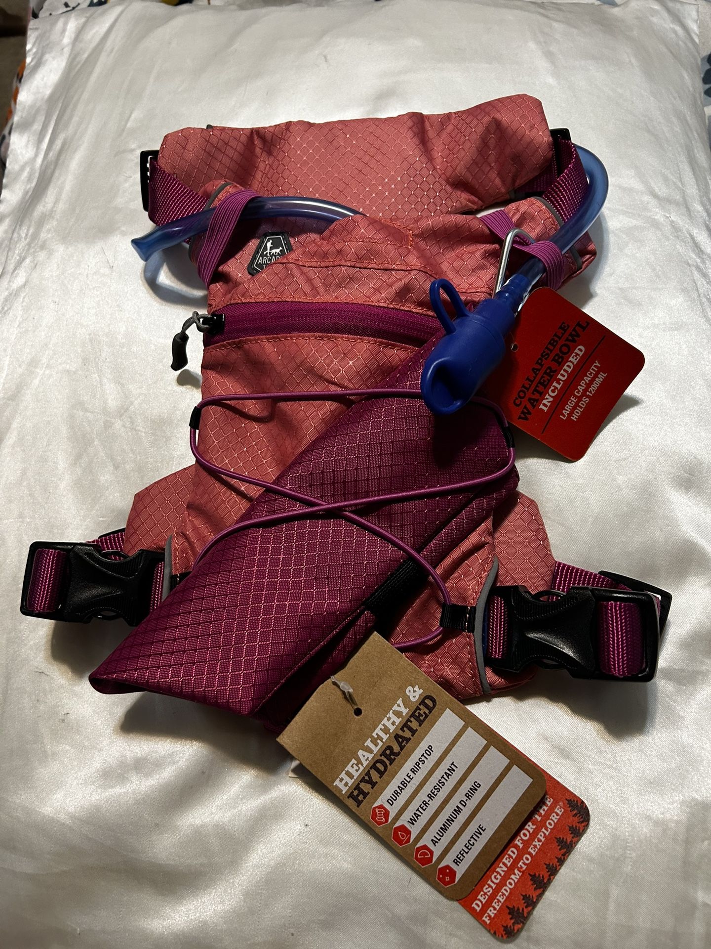 Medium sized dog harness. The brand is Arcadia Trail. It is unused as it was the wrong size for my dog. It holds a water bladder that holds 1200ML of water. It also includes a collapsible water bowl and has space for waste disposal bags. Tags included in pictures for additional information if desired!