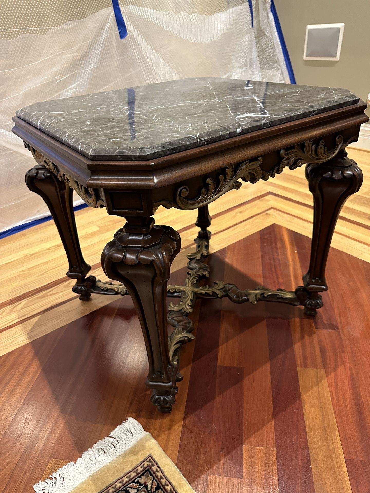 This Jade Traditional End Table is in beautiful condition! It is Cherry Wood with Detailed Gold Scroll Carvings and a Stone Top. Measurements: 27” X 27” Wide and 28” Tall