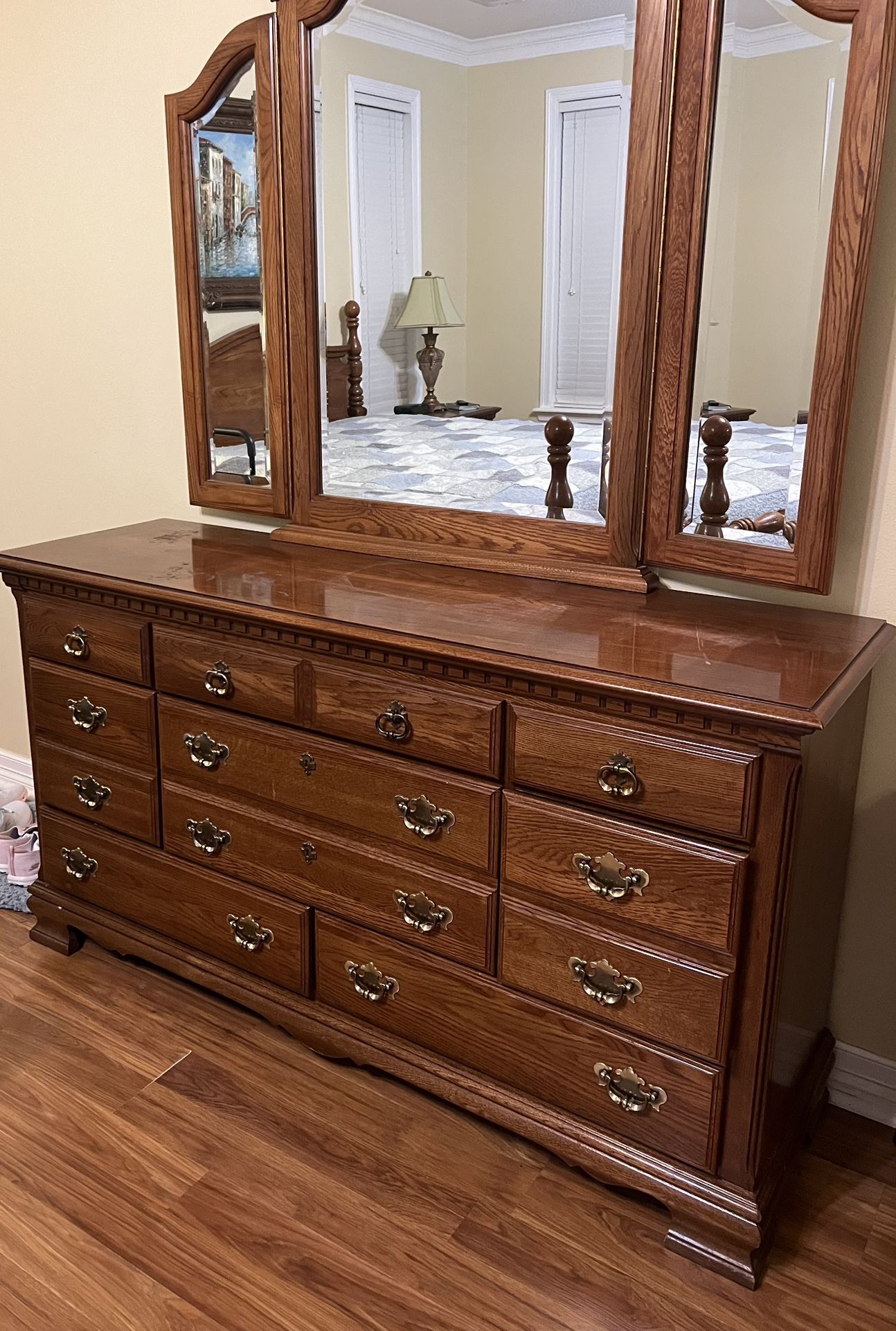 Bed, Dresser, Mirror, Nightstand