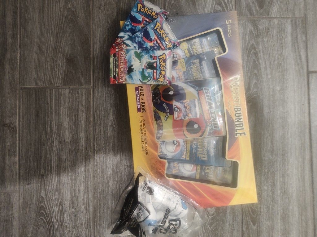 Bundle for 1 price Asking $25 for bundle 3 open packs of cards holo inside Pokemon toy and new unopen pokemon set from pristine bundle Asking $25