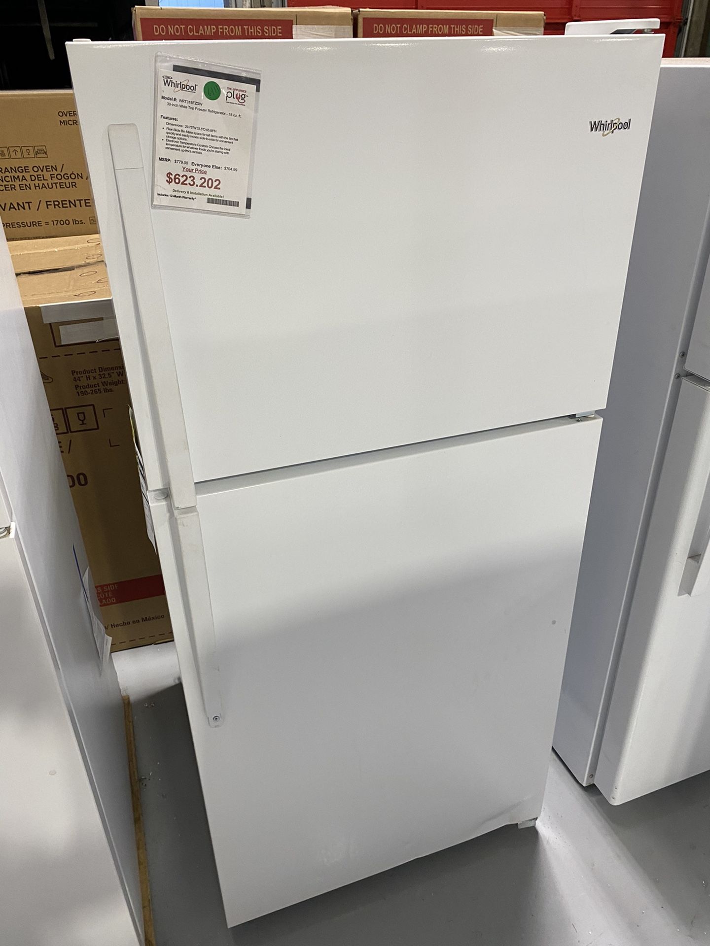 New Open Box Whirlpool White 30” Wide Top Freezer Refrigerator - 18 Cu. Ft. Model #WRT318FZDW Dimensions: 29.75”W 33.5”D 65.88”H Flexi-Side Bin: make space for tall items with the bin that quickly and easily moves side-to-side for convenient storage options. Electronic Temperature Controls: choose the ideal temperature for whatever foods you’re storing with convenient, up-front controls. Includes a 12-month warranty Financing Available Delivery and installation available Contact us with any questions or to stop by to see this unit and others. Open Monday - Saturday 10am - 6pm Our inventory changes daily. Message us for availability.
